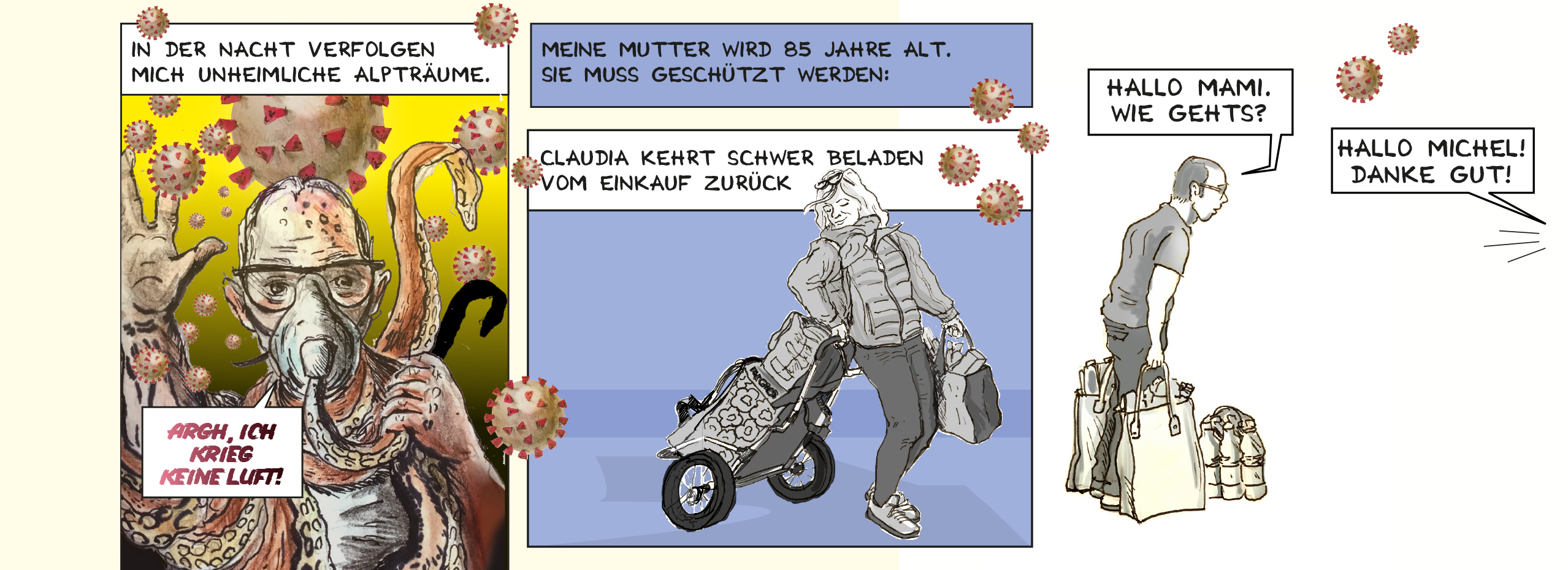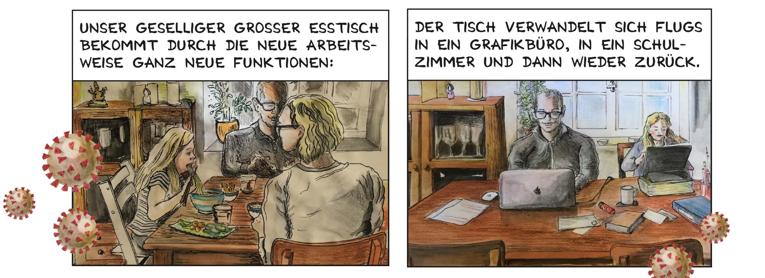 Während dem Home-Office mitten in der Corona Pandemie entstandener Comic über den Alltag im Lock-Down. Die Zeichnungen sind analog mittels Guache/Buntstift-Mischtechnik. angefertigt worden. Die Geschichte illustriert einen Familienalltag im ersten Corona-Lockdown.