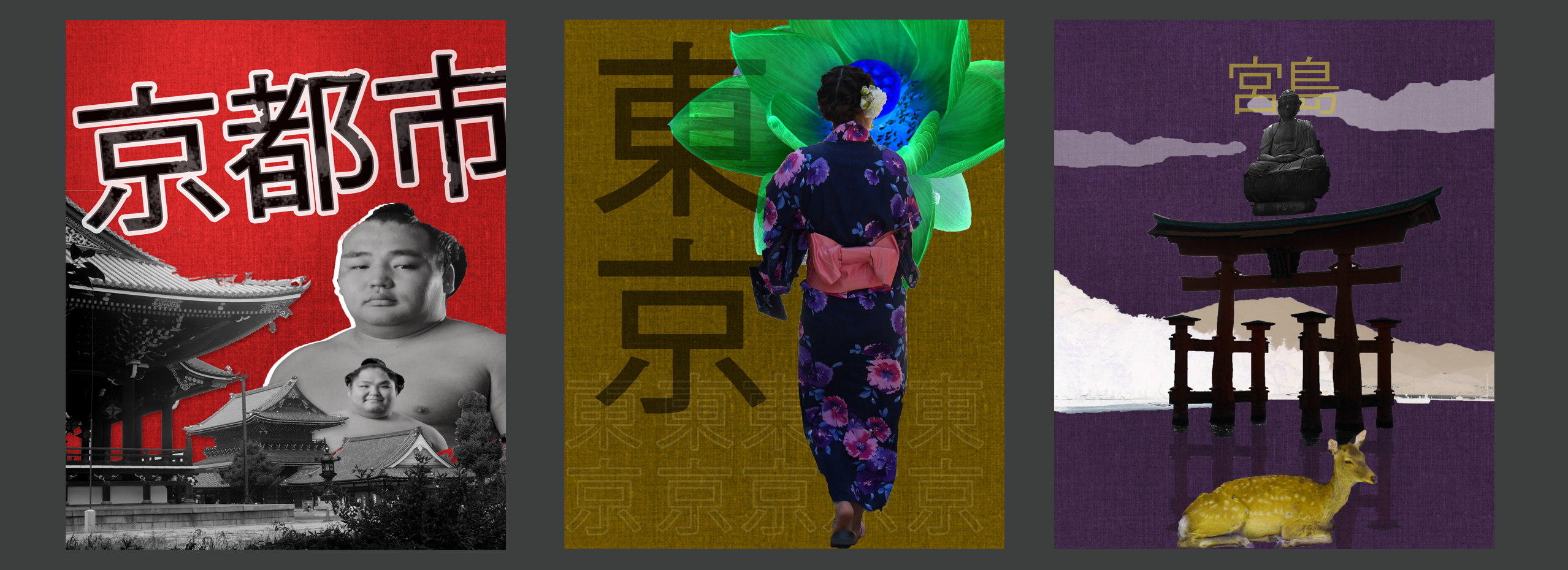 Kunst Welcome to Japan Druck auf Plexiglas. (19 cm x 23 cm) Digitale Collage aus verschiedenen Reise-Fotos die zu drei Sujets verarbeitet wurden.